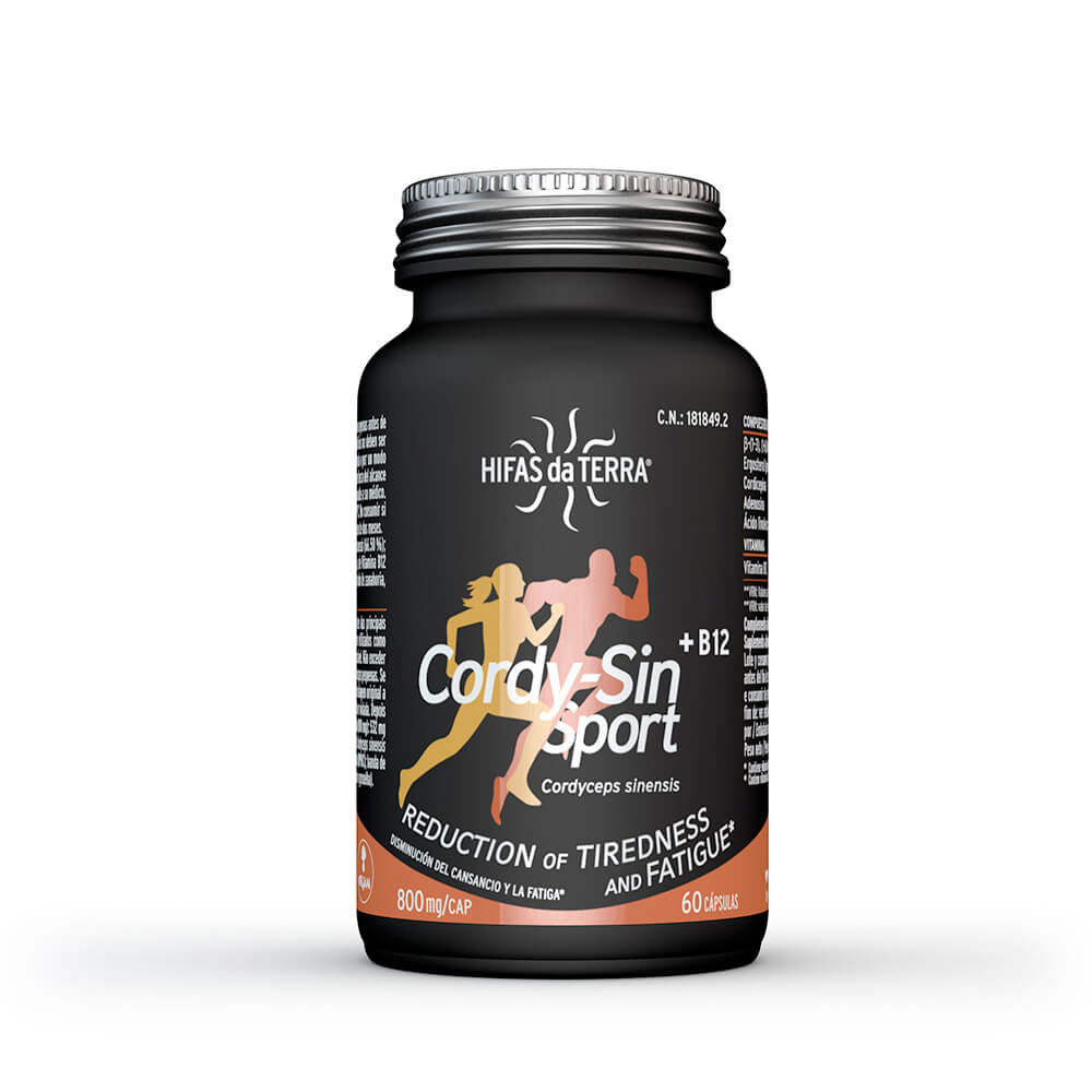 Cordy Sin Sport es un complemento alimenticio ecológico en cápsulas que te ayuda a mejorar tu rendimiento en los entrenamientos. Cordy Sin Sport contiene vitamina B12 ayuda a disminuir el cansancio y la fatiga. Este suplemento contiene las propiedades del hongo medicinal Cordyceps, una especie de uso común en las culturas orientales por sus propiedades energéticas e, incluso, tonificante. SU aporte energético hace que también se conozca como la viagra tibetana. A nivel científico se ha demostrado que contiene ergosterol, cordicepina, manitol y adenosina, sustancias relevantes a nivel energético.