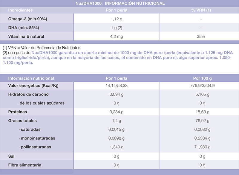 • NuaDHA1000 no tiene azúcares, ni gluten, ni OGM (Organismos Genéticamente Modificados),